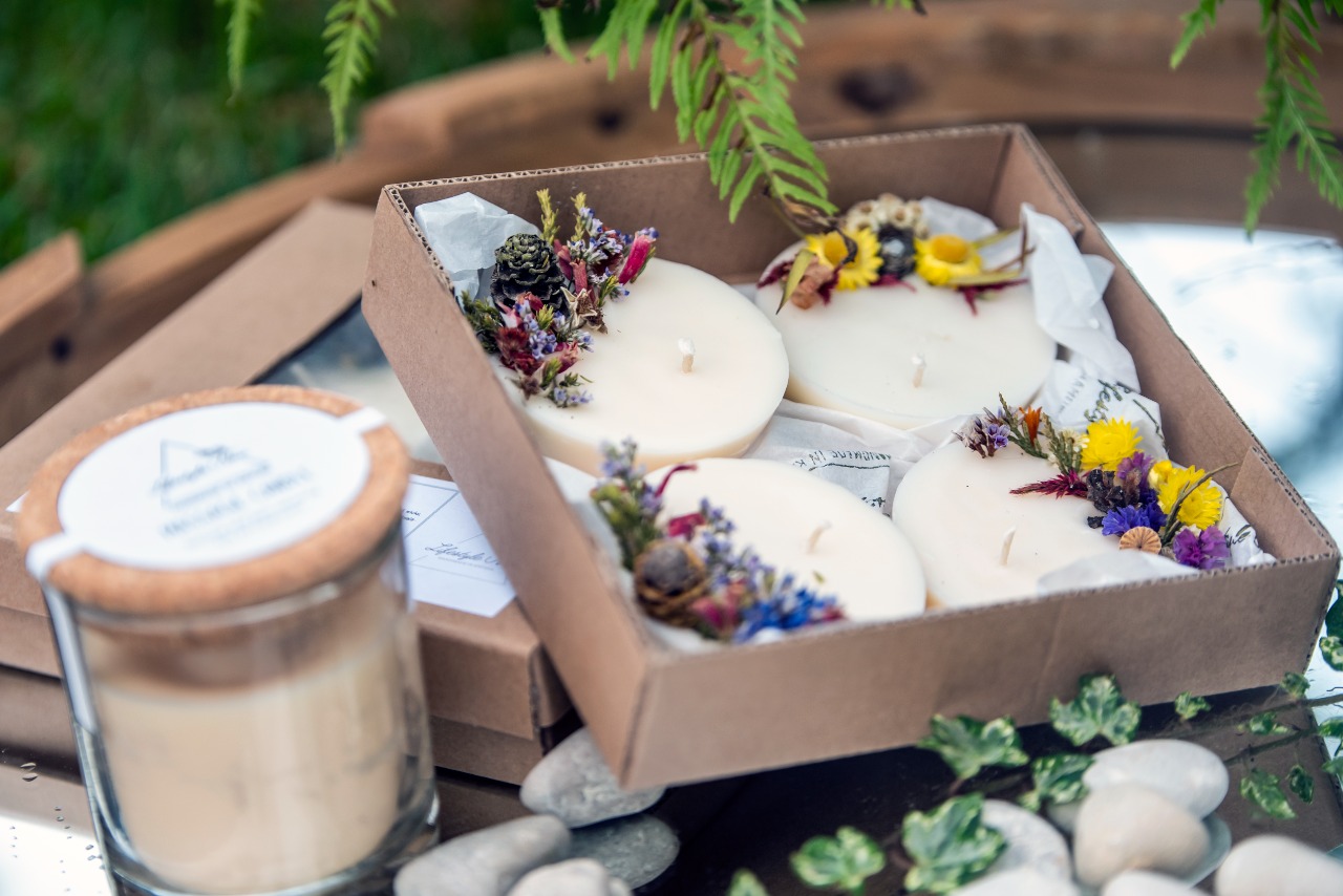 Made locally, in Knysna with the finest wax blend, wicks and decorated with dried flowers and scented with essential oil fragrances.